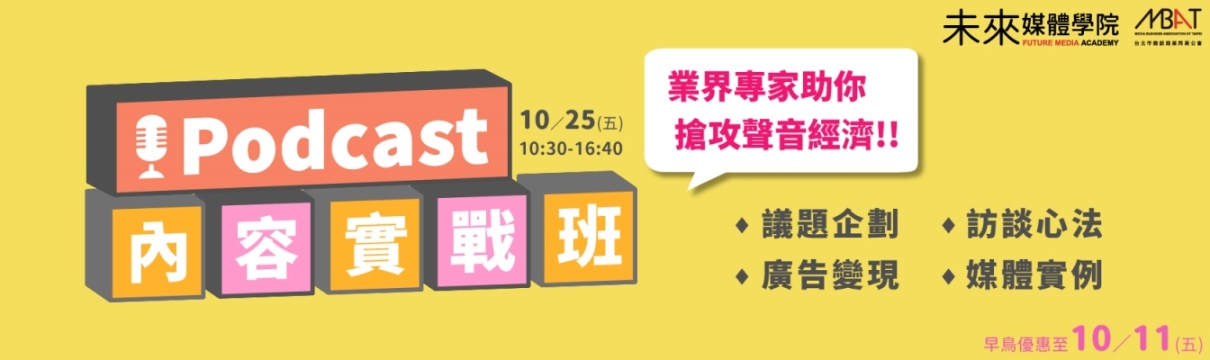 【內容變現】Podcast廣告怎麼做,媒體品牌如何創造商業價值?10/25(五) Podcast內容實戰班,把握最後報名機會 !!